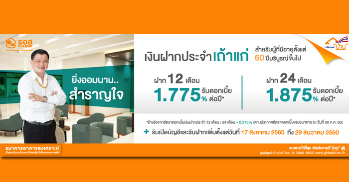 บัญชีเงินฝากประจำใหม่ เอาใจผู้สูงวัย ยิ่งออมนาน ยิ่งสำราญใจ กับบัญชีเงินฝากประจำระยะเวลาฝาก 12 และ 24 เดือน จ่ายดอกเบี้ยรายเดือน สำหรับลูกค้าบุคคลธรรมดาที่มีอายุตั้งแต่ 60 ปีบริบูรณ์ขึ้นไป