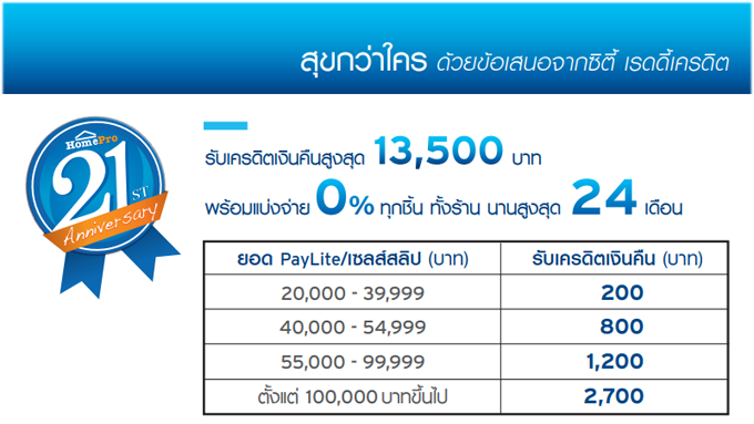 สุขกว่าใคร...ด้วยข้อเสนอจากซิตี้ เรดดี้เครดิต ฉลองครบรอบ 21 ปี HomePro รับเครดิตเงินคืนสูงสุด 13,500 บาท พร้อมแบ่งจ่าย 0% ทุกชิ้น ทั้งร้าน นานสูงสุด 24 เดือน