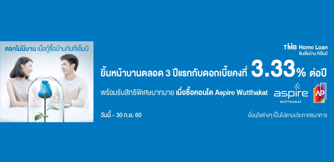 สินเชื่อบ้านทีเอ็มบี ดอกเบี้ย 3.33% นาน 3 ปีแรก พร้อมรับสิทธิพิเศษเมื่อซื้อคอนโด Aspire Wutthakat