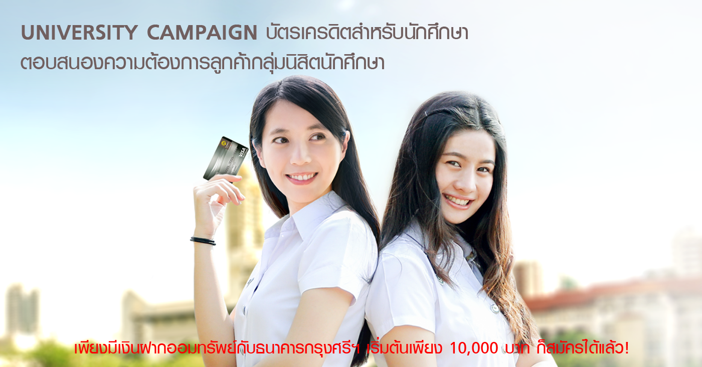เงื่อนไขการสมัครบัตรเครดิตสำหรับนักศึกษา - สงวนสิทธิ์เฉพาะนิสิต นักศึกษาที่สมัครบัตรเครดิต กรุงศรี โดยใช้บัญชีเงินฝากประเภทออมทรัพย์ของธนาคากรุงศรีอยุธยา จำกัด (มหาชน) เป็นประกันหนี้บัตรเครดิตเท่านั้น