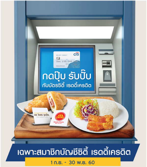 เงื่อนไขธนาคารซิตี้แบงก์ : สมาชิกบัญชีซิตี้ เรดดี้เครดิต รับฟรี ครัวซองค์แฮมชีส 1 ชิ้น มูลค่า 80 บาท จาก au bon pain หรือจ่ายเพียง 1 บาท รับข้าวไก่กรอบซอสน้ำปลา 1 จาน มูลค่า 75 บาท จาก Chester's