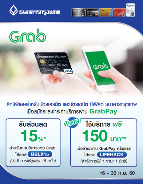 - รับส่วนลด 15% สำหรับบริการของ Grab ใส่รหัส BBLX15 (จำกัดการใช้สูงสุด 15 ครั้ง)