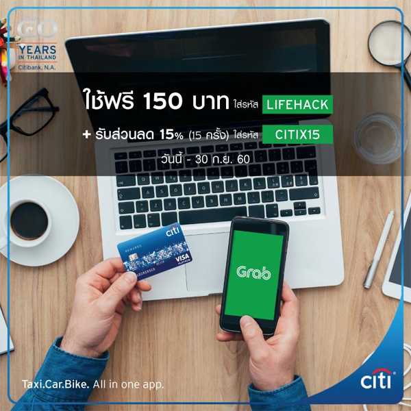 รายละเอียดโปรโมชั่น : สมาชิกบัตรเครดิตซิตี้ ใช้ Grab ทุกบริการ รับส่วนลด 15% จำนวน 15 ครั้ง เพียงใส่รหัส "CITIX15" และ พิเศษ! สำหรับผู้ใช้บริการครั้งแรก สามารถใช้บริการฟรี 150 บาท เพียงใส่รหัส "LIFEHACK"
