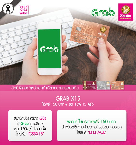 - สมาชิกบัตรเครดิต GSB ใช้ Grab ทุกบริการ ลด 15% จำนวน 15 ครั้ง ใส่รหัส "GSBX15"