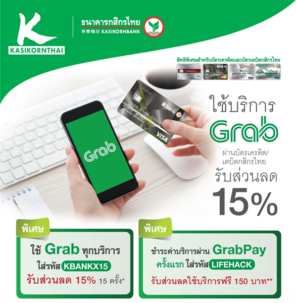 - พิเศษ ใช้ Grab ทุกบริการ ใส่รหัส KBANKX15 รับส่วนลด 15% 15 ครั้ง