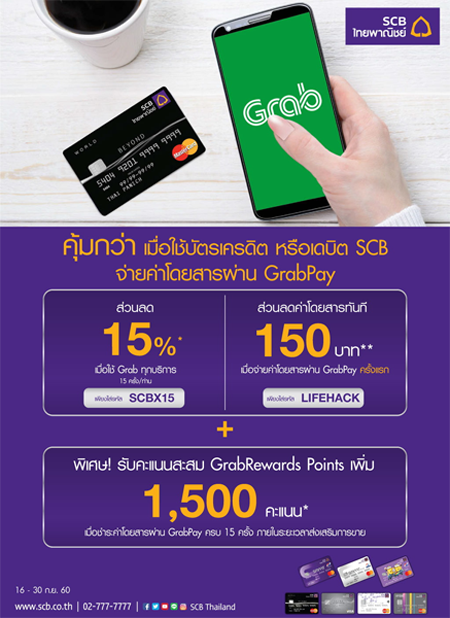 รายละเอียดโปรโมชั่น : คุ้มกว่า เมื่อใช้บัตรเครดิต หรือเดบิต SCB จ่ายค่าโดยสารผ่าน GrabPay