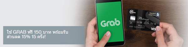 จ่าย Grab ด้วยบัตรเครดิต/ บัตรเดบิต ลด 15% 15 ครั้ง พร้อมใช้ฟรี 150 บาท เมื่อใช้บริการครั้งแรก