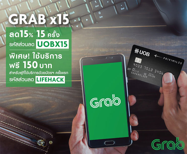 - รับส่วนลด 15% จำนวน 15 ครั้ง เมื่อใช้บริการ Grab และใส่รหัส UOBX15