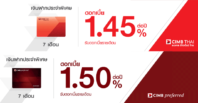 บัญชีเงินฝากประจำพิเศษ 7 เดือน อัตราดอกเบี้ย 1.50% ต่อปี สำหรับลูกค้า CIMB Preferred