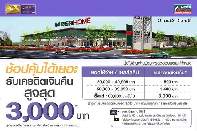 เงื่อนไขรายการส่งเสริมการขาย - สิทธิพิเศษสำหรับผู้ถือบัตรเครดิตอิออนทุกประเภท (ยกเว้นบัตรเครดิตเพื่อองค์กร) ที่ออกโดยบริษัท อิออน ธนสินทรัพย์ (ไทยแลนด์) จำกัด (มหาชน) ซึ่งมียอดใช้จ่ายผ่านบัตรเครดิตอิออนนแบบชำระเต็มจำนวนหรือแบ่งชำระที่เมกา โฮม ทุกสาขา ตั้งแต่วันที่ 28 ก.ย. 60 - 2 ม.ค. 61 (97 วัน)