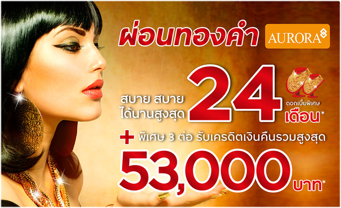 ผ่อนทองคำ Aurora สบาย สบาย ได้นานสูงสุด 24 เดือน พร้อมพิเศษ 3 ต่อ รับเครดิตเงินคืนรวมสูงสุด 53,000 - พิเศษ 1 รับเครดิตเงินคืนสูงสุด 10,000 บาท