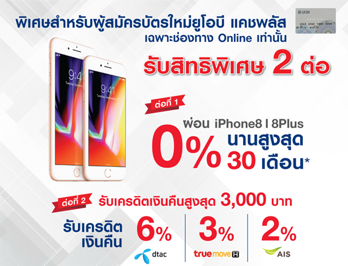 พิเศษ!! สำหรับลูกค้าใหม่บัตรยูโอบี แคชพลัส รับเครดิตเงินคืนสูงสุด 6% เมื่อสมัครบัตรเครดิตยูโอบี พร้อมบัตรยูโอบี แคชพลัสผ่านช่องทางการสมัคร Online ส่วน 4% สำหรับลูกค้าผู้ถือบัตรอยู่แล้ว นำบัตรฯมารูดผ่อนชำระสินค้าiPhone8/ iPhone8Plus/iPhoneX ที่ DTAC Shop, True, AIS ทุกสาขา วันนี้ - 31 ม.ค. 61 *แบ่งชำระ 0% นาน 30 เดือนเฉพาะร้านค้า Dtac และผ่อน 0% นาน 24% ที่ True และ AIS