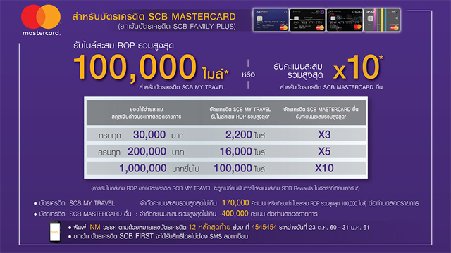 - สำหรับบัตรเครดิต SCB MASTERCARD รับไมล์สะสม ROP รวมสูงสุด 100,000 ไมล์ หรือรับคะแนนสะสมรวมสูงสุด X10 เมื่อมียอดใช้จ่ายสะสมตามเงื่อนไขที่กำหนด