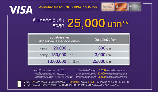 - สำหรับบัตรเครดิต SCB VISA ทุกประเภทรับเครดิตเงินคืนสูงสุด 25,000 บาท เมื่อมียอดใช้จ่ายสะสมตามเงื่อนไขที่กำหนด
