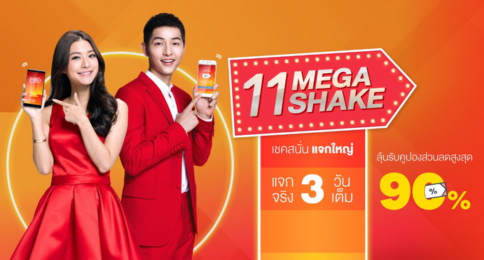 - Mega Shake: หยิบมือถือขึ้นมาเชคแล้วรับส่วนลดไปเลย! เล่นเกม Mega Shake ได้ง่ายๆ แค่เลือกคูปองส่วนลดที่ต้องการและเชคให้ได้จำนวนครั้งที่กำหนด โดยคูปองมีให้เลือกทั้ง 90%, 50%, 30%, 20% และ 11% (คูปองมีจำนวนจำกัด มาก่อนได้ก่อน) โดยเกมจะเริ่มเวลา 11:00 น. ของวันที่ 11 - 13 พฤศจิกายน 2560 กติกาง่ายๆ แค่นี้ เช่น ถ้าต้องการคูปองลด 90% จะต้องเขย่ามือถือให้ได้ ภายในเวลา 11 วินาที เชคสนั่น แจกใหญ่ตลอด 3 วันเท่านั้น!!