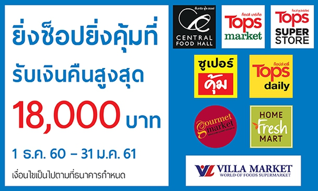 - เมื่อใช้จ่ายผ่านบัตรเครดิต TMB ที่ Gourmet Market & Home Fresh Mart ทุกสาขา, เซ็นทรัล ฟู้ด ฮอลล์, ท็อปส์ มาร์เก็ต, ท็อปส์ ซูเปอร์สโตร์, ท็อปส์ ซูเปอร์คุ้ม ทุกสาขา และ Villa Market ทุกสาขา ระหว่างวันที่ 1 ธ.ค. 60 - 31 ม.ค. 61 โดยจะนำยอดใช้จ่ายสูงสุดต่อเซลล์สลิปตลอดรายการมาคำนวณเพื่อรับเงินคืน ไม่รวม ยอดใช้จ่ายในเชิงธุรกิจ ยอดใช้จ่ายที่ถูกยกเลิก และยอดใช้จ่ายที่มีการคืนสินค้าภายหลัง