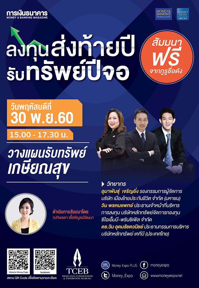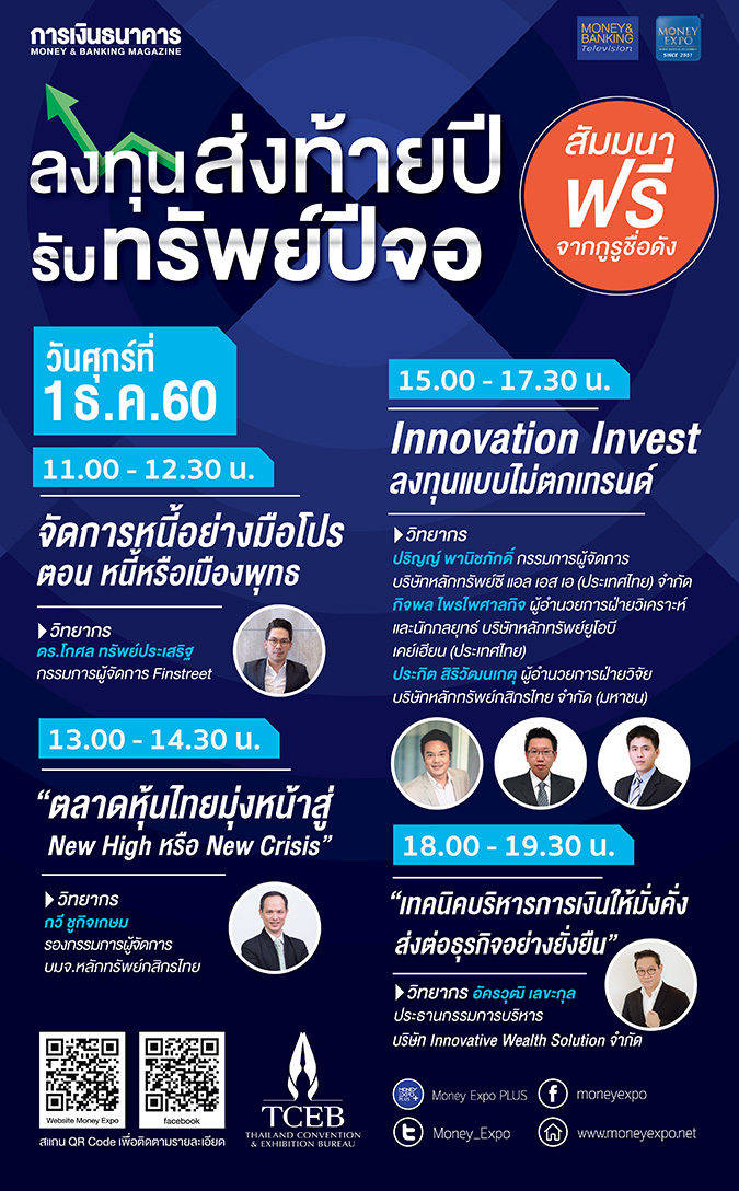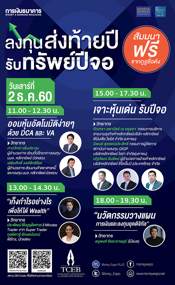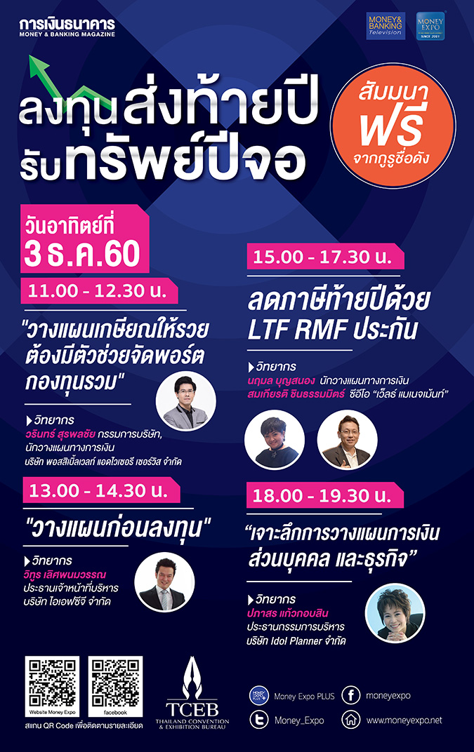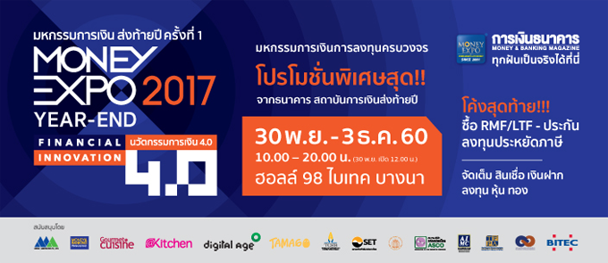 มหกรรมการเงินส่งท้ายปี ครั้งที่ 1 Money Expo Year-End 2017 ทุ่มโปรโมชั่นแรงส่งท้ายปี กู้บ้าน/รีไฟแนนซ์บ้าน ดอกเบี้ย 0% นาน 1 ปี พร้อมรับสิทธิ์ลุ้นทองกองเต็มบ้าน เงินฝาก Step Up ดอกเบี้ยสูงสุด 3% ต่อปี สินเชื่อเอสเอ็มอี อัตราดอกเบี้ย 4% ต่อปี วงเงินกู้สูงสุด 100 ล้านบาท ซื้อประกันชีวิต รับฟรีทัวร์สวิส-ฝรั่งเศส/ทองคำ วันที่ 30 พ.ย. - 3 ธ.ค. 60 ศูนย์นิทรรศการและการประชุมไบเทค บางนา