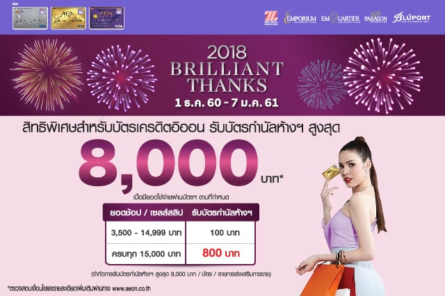 2018 Brilliant Thanks สิทธิพิเศษสำหรับบัตรเครดิตอิออน รับบัตรกำนัลห้างฯ สูงสุด 8,000 บาท เมื่อมียอดใช้จ่ายผ่านบัตรเครดิตอิออน ตามจำนวนที่กำหนด ณ ห้างสรรพสินค้าเดอะมอลล์ทุกสาขา, เอ็มโพเรียม, เอ็มควอเทียร์, พารากอน และบลูพอร์ต หัวหิน (โซนห้างสรรพสินค้า)
