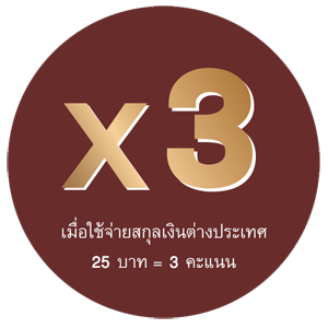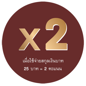 - รับคะแนนสะสม X2 เมื่อใช้จ่ายเป็นสกุลเงินบาท (25 บาท รับ 2 คะแนน)