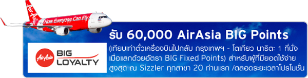 พิเศษ! รับ 60,000 AirAsia BIG Points (เทียบเท่าตั๋วเครื่องบินไป-กลับ กรุงเทพฯ - โตเกียว นาริตะ 1 ที่นั่ง เมื่อแลกด้วยอัตรา BIG Fixed Points) สำหรับผู้ที่มียอดใช้จ่ายสูงสุด ณ Sizzler ทุกสาขา 20 ท่านแรก/ ตลอดระยะเวลาโปรโมชั่น