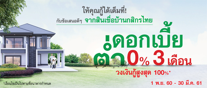 ดอกเบี้ยต่ำ 0% 3 เดือน วงเงินกู้สูงสุด 100% ข้อเสนอดีๆ จากสินเชื่อบ้านกสิกรไทย ถึง 30 ม.ค. 61