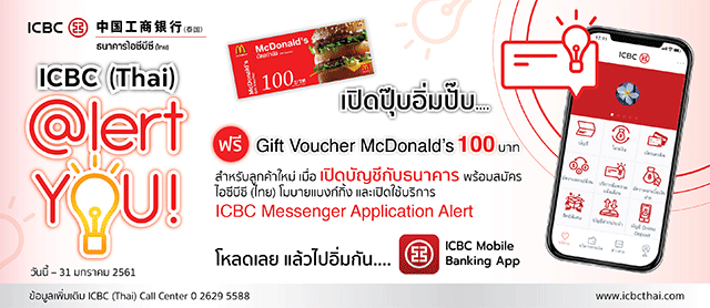 ลูกค้าใหม่ที่เปิดบัญชีกับธนาคาร ICBC พร้อมสมัครไอซีบีซี (ไทย) โมบายแบงก์กิ้ง และเปิดใช้บริการ ICBC Messenger Application Alert รับฟรี Gift Voucher McDonald's 100 บาท
