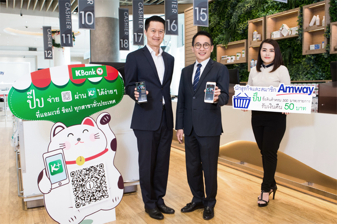 นายพัชร สมะลาภา (ซ้าย) รองกรรมการผู้จัดการอาวุโส ธนาคารกสิกรไทย และนายกิจธวัช ฤทธีราวี (ที่ 2 จากซ้าย) กรรมการผู้จัดการบริษัท แอมเวย์ (ประเทศไทย) จำกัด เปิดตัวบริการรับชำระเงินด้วย "คิวอาร์ โค้ด" (QR Code) เป็นครั้งแรกของธุรกิจขายตรงในประเทศไทย เพิ่มความสะดวกให้แก่นักธุรกิจแอมเวย์ และสมาชิกให้สามารถชำระเงินค่าสินค้าด้วย "คิวอาร์ โค้ด" โดยเปิดให้ใช้บริการแล้ววันนี้ ณ แอมเวย์ ช็อปทุกสาขาทั่วประเทศ พร้อมรับโปรโมชั่นพิเศษเมื่อมียอดชำระเงินด้วย QR Code ผ่านแอปพลิเคชัน K PLUS ตั้งแต่ 300 บาทขึ้นไป/รายการ รับเงินคืนเข้าบัญชี 50 บาท จนถึงวันที่ 31 มีนาคม 2561 ณ แอมเวย์ ช็อป สำนักงานใหญ่ เมื่อเร็ว ๆ นี้