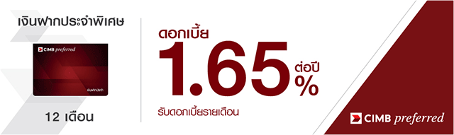 บัญชีเงินฝากประจำพิเศษ 12 เดือน Preferred* สำหรับลูกค้า CIMB Preferred : อัตราดอกเบี้ย 1.65% ต่อปี บัญชีเงินฝากประจำพิเศษ 6 เดือน Preferred* สำหรับลูกค้า CIMB Preferred : อัตราดอกเบี้ย 1.50% ต่อปี ระยะเวลาโปรโมชั่น : 1 - 31 มกราคม 2561