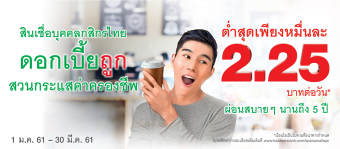 - สำหรับลูกค้าที่เป็นพนักงานประจำ / มีรายได้ประจำ ที่ได้รับอนุมัติวงเงินสินเชื่อตั้งแต่ 240,001 บาทขึ้นไป และมีระยะเวลาผ่อนชำระ 12 เดือน จะได้รับข้อเสนอดอกเบี้ยพิเศษต่ำสุดหมื่นละ 2.56 บาทต่อวัน เป็นดอกเบี้ยแบบประมาณการ โดยคำนวณจากดอกเบี้ยแบบลดต้นลดดอก (Effective Rate) ในอัตรา 17% ต่อปี กรณีลูกค้าที่ได้รับอนุมัติวงเงินสินเชื่อตั้งแต่ 240,001 บาทขึ้นไป และมีระยะเวลาผ่อนชำระมากกว่า 12 เดือนขึ้นไป จะได้รับอัตราดอกเบี้ยแบบลดต้นลดดอก (Effective Rate) 18% ต่อปี ตลอดระยะเวลาของสัญญาเงินกู้ - ลูกค้าที่เข้าร่วมโครงการสินเชื่อบุคคลกสิกรไทยดอกเบี้ยต่ำสุด 2.25 บาทต่อวัน ต้องเป็นลูกค้าใหม่ ที่ยื่นสมัครสินเชื่อบุคคลกสิกรไทย (K-Personal Loan) ระหว่างวันที่ 1 ม.ค. 61 - 31 มี.ค. 61 และจะต้องได้รับการอนุมัติภายในวันที่ 30 เม.ย. 61 เท่านั้น