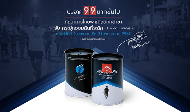 โครงการก้าวคนละก้าว : บริจาค 99 บาทขึ้นไปที่ธนาคารไทยพาณิชย์ทุกสาขา รับฟรี!กระปุกออมสินที่ระลึก 1 ใบต่อ 1 รายการ ตั้งแต่วันที่ 9 มกราคม ถึง 31 พฤษภาคม 2561 (หรือจนกว่ากระปุกจะหมด)หมายเหตุ :