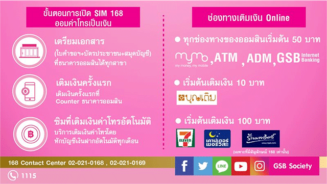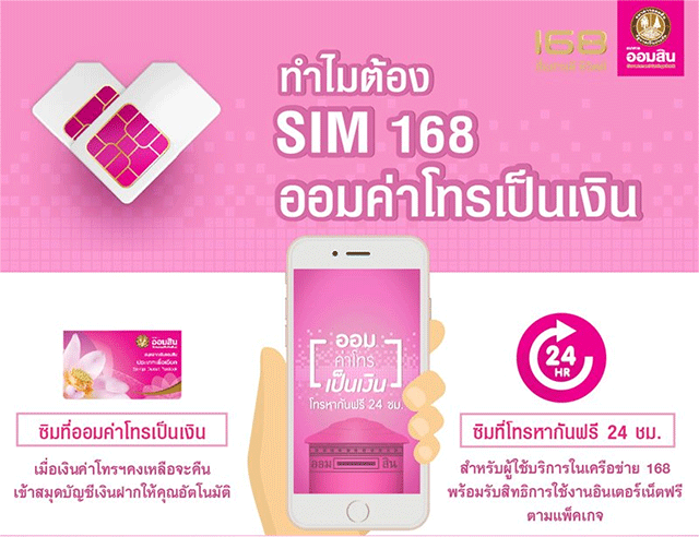 ธนาคารออมสิน ให้คุณออมค่าโทรเป็นเงิน โทรหากันฟรี 24 ชม. ลูกค้าของธนาคารออมสิน สามารถติดต่อขอรับซิม 168 (ออมค่าโทรเป็นเงิน) ได้ที่ธนาคารออมสินทุกสาขา โดยไม่มีค่าใช้จ่าย