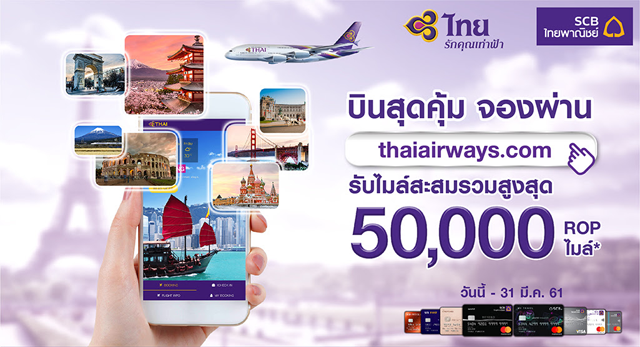 บินสุดคุ้ม รับไมล์สะสม ROP สูงสุด 50,000 ไมล์ เมื่อจองตั๋วเครื่องบินผ่าน thaiairways.com ด้วยบัตรฯ SCB