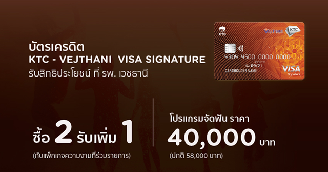 สิทธิประโยชน์พิเศษ สมัคร บัตรเครดิต KTC - VEJTHANI VISA SIGNATURE รับสิทธิประโยชน์ที่ รพ. เวชธานี ซื้อ 2 รับเพิ่ม 1 (กับแพ็กเกจความงามที่ร่วมรายการ) และ โปรแกรมจัดฟันราคา 40,000 บาท (จากปกติ 58,000 บาท)