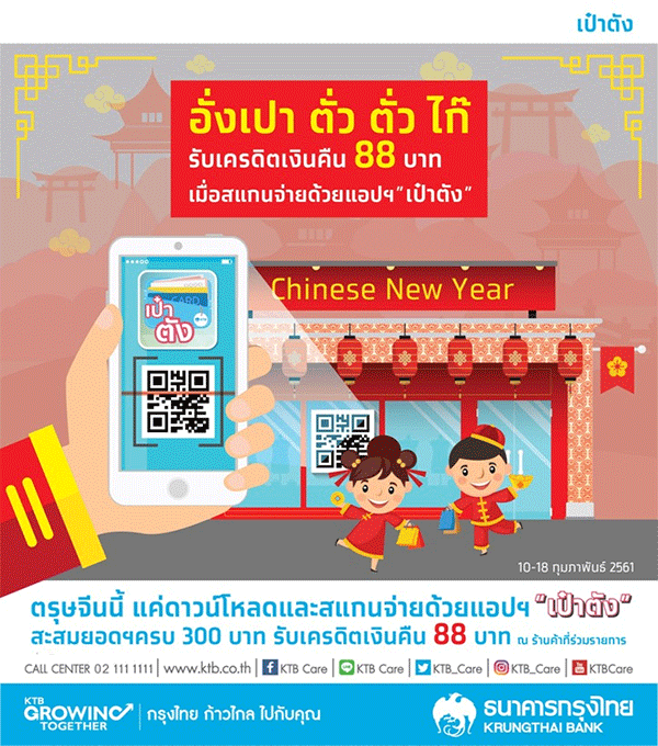 ตรุษจีนนี้ รับเครดิตเงินคืน 88 บาท เมื่อดาวน์โหลด และสแกนจ่ายด้วยแอปฯ "เป๋าตัง"