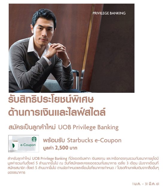 สมัครเป็นลูกค้าใหม่ UOB Privilege Banking รับ Starbucks e-Coupon มูลค่า 2,500 บาท