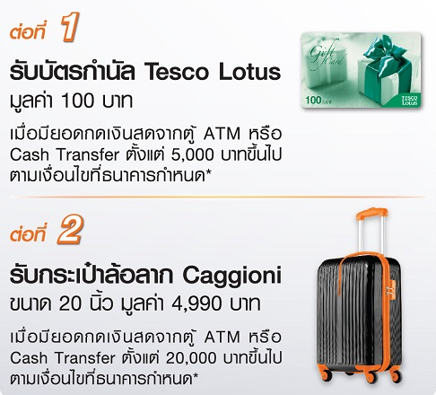 - ต่อที่ 1 รับบัตรกำนัลเทสโก้โลตัส มูลค่า 100 บาท จำนวน 1 ใบ เมื่อมียอดเบิกถอนเงินสดจากช่องทาง ATM หรือ Cash Transfer ตั้งแต่ 5,000 บาทขึ้นไป ภายใน 30 วันนับจากวันที่ได้รับอนุมัติบัตร และมียอดคงค้าง ณ วันปิดรอบบัญชีไม่ต่ำกว่า 4,000 บาท ในแต่ละรอบภายในระยะเวลา 2 รอบบัญชี
