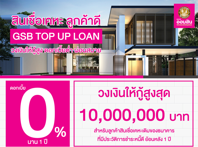 สินเชื่อเคหะ ลูกค้าดี GSB TOP UP LOAN วงเงินให้กู้สูง ดอกเบี้ยต่ำ ผ่อนสบาย จาก ธ.ออมสิน