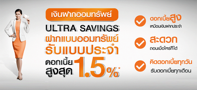 บัญชีเงินฝากออมทรัพย์ ULTRA SAVINGS ฝากแบบออมทรัพย์ รับแบบประจำ ดอกเบี้ยสูงสุด 1.50%*