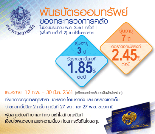 ลงทุนอย่างมั่นใจกับพันธบัตรออมทรัพย์ของกระทรวงการคลัง ในปีงบประมาณ พ.ศ. 2561 ครั้งที่ 1 (เพิ่มเติมครั้งที่ 2)