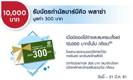 - รับบัตรกำนัลบาร์บีคิว พลาซ่า มูลค่า 300 บาท เมื่อมียอดใช้จ่ายสะสมครบตั้งแต่ 10,000 บาทขึ้นไป/ เดือน