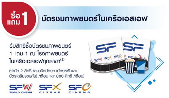- รับสิทธิ์ซื้อ 1 แถมฟรี 1 บัตรชมภาพยนตร์ในเครือเอสเอฟ ทุกสาขา