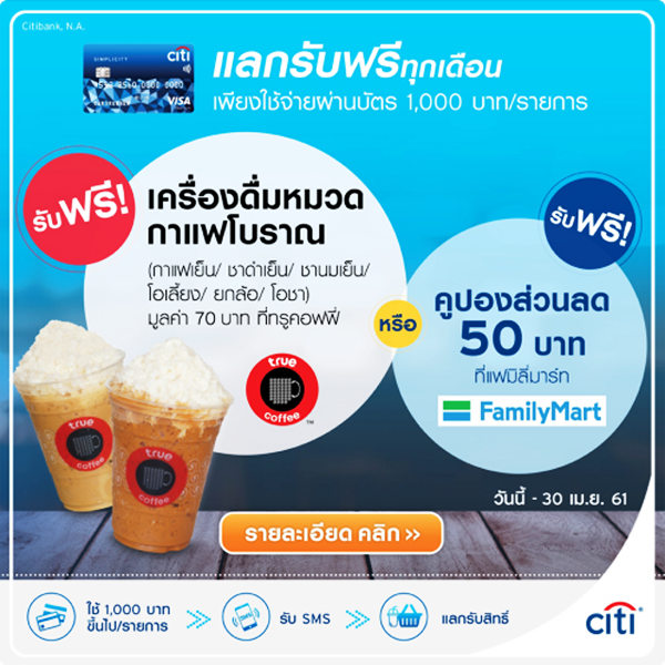 บัตรเครดิตซิตี้ ซิมพลิซิตี้ (Citi Simplicity) ตั้งแต่ 1,000 บาท/ รายการ ที่ร้าน True Coffee หรือ FamilyMart