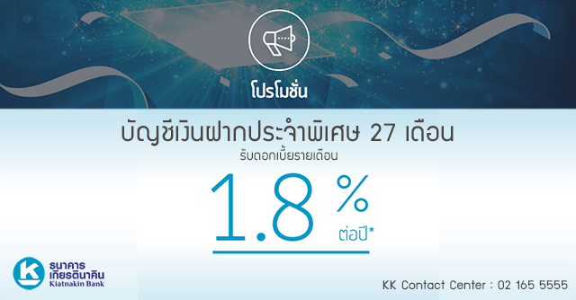 โปรโมชั่นบัญชีเงินฝากจากธนาคารเกียรตินาคิน เสนอบัญชีเงินฝากประจำพิเศษ 27 เดือน KK Fixed Deposit ให้ดอกเบี้ยสูง และรับดอกเบี้ยได้ทุกเดือน