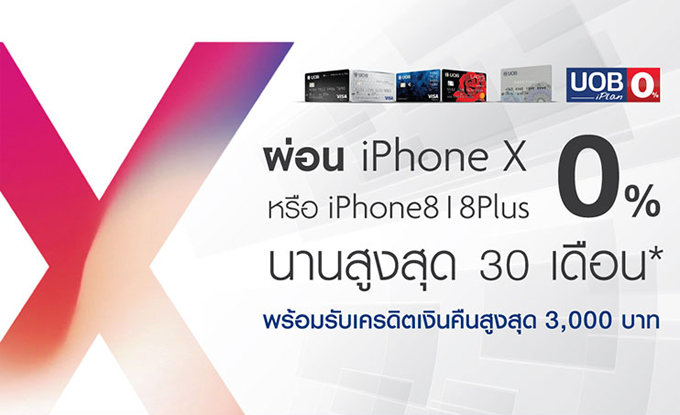 ผ่อน iPhone X หรือ iPhone8/8Plus 0% นาน 30 เดือน พร้อมรับเครดิตเงินคืน จาก ธ.ยูโอบี