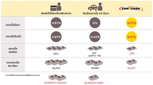 ตารางเปรียบเทียบดอกเบี้ยระหว่าง สินเชื่อไม่ใช้รถเป็นหลักประกัน กับ สินเชื่อดอกเบี้ย 0% ปีแรก และ คาร์ ฟอร์ แคช 0.27% ที่วงเงินประกัน 100,000 บาท ระยะเวลาผ่อนชำระ 60 เดือน
