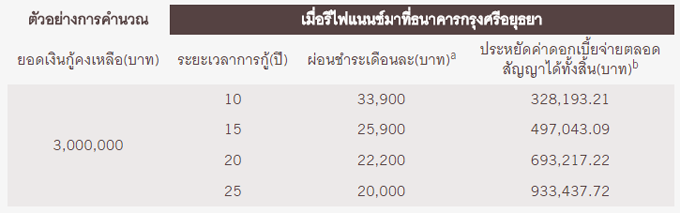 a. คำนวณจากการผ่อนสินเชื่อบ้านกรุงศรีรีไฟแนนซ์ อัตราดอกเบี้ย : ปีที่ 1 คงที่ 2.90% ต่อปี, ปีที่ 2 คงที่ 3.90% ต่อปี, ปีที่ 3 คงที่ 4.90% ต่อปี หลังจากนั้น MRR - 2.35% ต่อปี