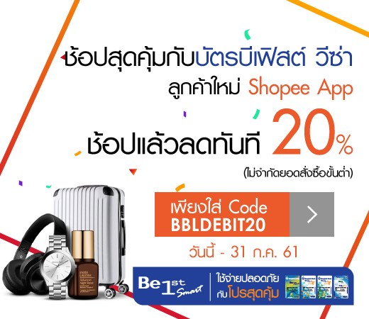 พิเศษ! สำหรับลูกค้าใหม่ของ Shopee App ช้อปสุดคุ้มบน Shopee App ด้วยบัตรบีเฟิสต์ วีซ่า ใส่ Code BBLDEBIT20 ลดทันที 20% ไม่จำกัดยอดสั่งซื้อขั้นต่ำ