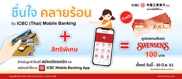 ชื่นใจ คลายร้อน กับ ICBC (Thai) Mobile Banking สำหรับลูกค้าใหม่ที่สมัครบัตรเดบิต และสมัครเข้าใช้งาน ICBC Mobile Banking App รับฟรี!คูปอง Swensen's 100 บาท