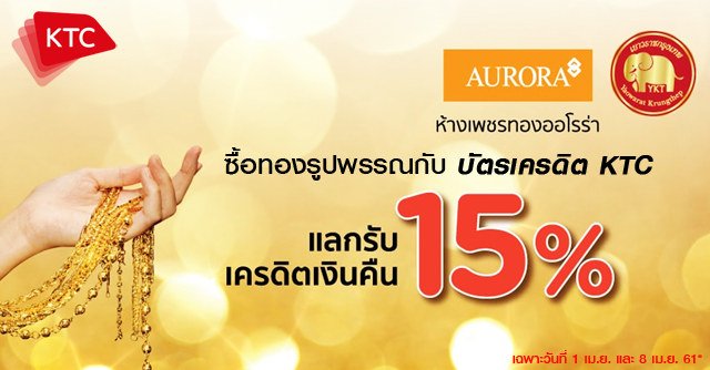 วันเดียวเท่านั้น ซื้อทองรูปพรรณกับบัตรเครดิต KTC แลกรับเครดิตเงินคืน 15% เมื่อใช้คะแนนสะสม KTC FOREVER REWARDS ของคะแนนที่ใช้แลก เมื่อมียอดใช้จ่ายทองรูปพรรณ ที่ห้างเพชรทองออโรร่า และห้างทองเยาวราช (ใช้คะแนนตั้งแต่ 1,000 คะแนนขึ้นไป สูงสุดไม่เกินยอดใช้จ่ายต่อเซลส์สลิป)