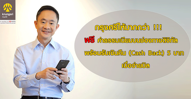 กรุงศรีให้มากกว่า !!! ฟรีค่าธรรมเนียมบนช่องทางดิจิทัล พร้อมรับเงินคืน (Cash Back) 5 บาทเมื่อจ่ายบิล